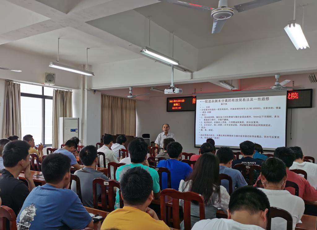 本网讯 5月25日上午,中南大学黄开国教授来校在黄金校区逸夫楼第二会议室做了题为“复杂混合多金属粉末综合回收技术”学术报告。我院院长何桂春、党委副书记饶先发、院长助理余新阳,矿物加工工程、环境工程教师以及研究生聆听了报告。报告由何桂春主持。