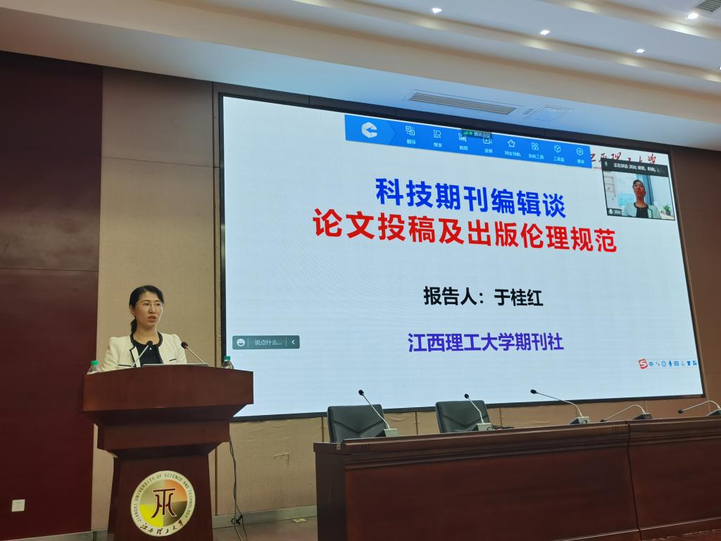 本网讯 11月21日,由研究生院、期刊社主办,我院承办的“科技期刊编辑谈论文投稿及出版伦理规范”学术报告在黄金校区逸夫楼学术报告厅举行。期刊社副编审于桂红博士受邀担任主讲。报告采用“线上+线下”的方式进行,我院党委副书记饶先发、研究生院和期刊社全体人员、我院在校研究生线下参加了报告,三江校区、黄金校区、红旗校区和南昌校区其他全体研究生在线聆听了报告。报告由饶先发和研究生院洪治老师共同主持。