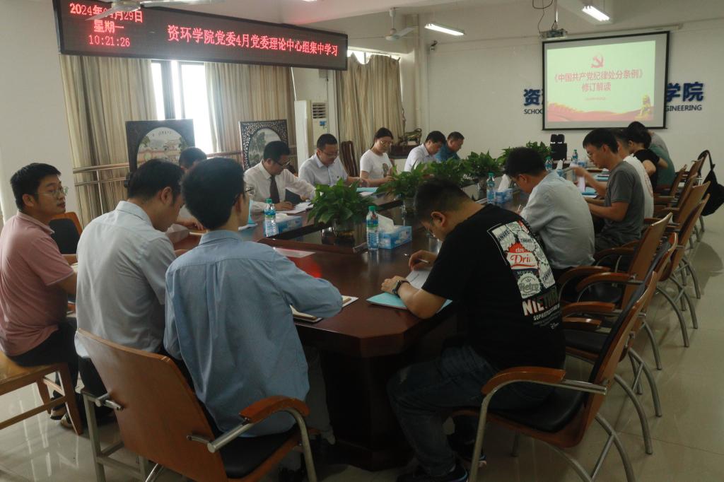 本网讯  为进一步学党纪强党性、增强纪律意识4月29日,我院黄金校区逸夫楼第一会议室召开4月党委理论学习中心组集中学习会,资源与环境工程学院领导班子成员、党委委员、党支部书记以及法学院相关领导老师参加本次学习会。会议由学院党委书记陈明主持。