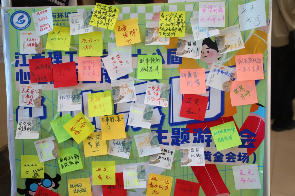 活动内容丰富形式多样,趣味性强,体验感十足,同学们也都积极参与,乐在其中,现场欢声笑语,温暖和谐。每完成一个环节,参与者都可以选择朋辈心理辅导服务中心准备的精美礼品,并且参与者可以在许愿展板上用便利贴写下自己的心愿,表达出自己美好的祝福。