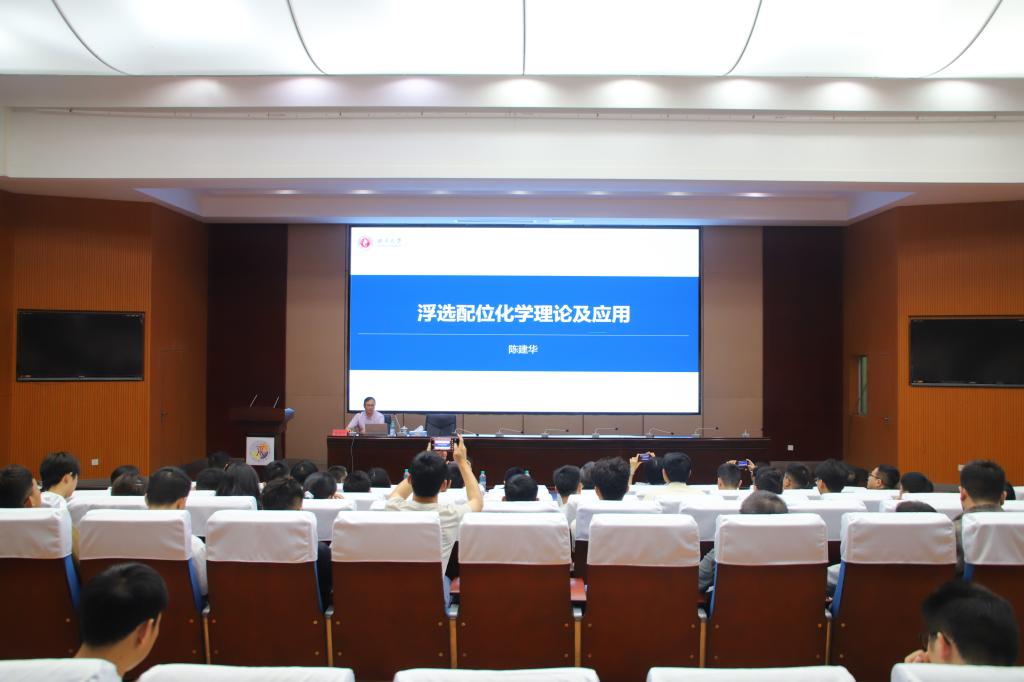 本网讯 6月5日,广西大学博士生导师陈建华教授一行来校交流,并在黄金校区逸夫楼报告厅做了以“矿物浮选界面配位化学原理”为主题的学术报告。校国际创新研究院执行院长邱廷省、我院副院长余新阳以及相关专业教师、本科生、研究生等参与本次讲座。讲座由余新阳主持。