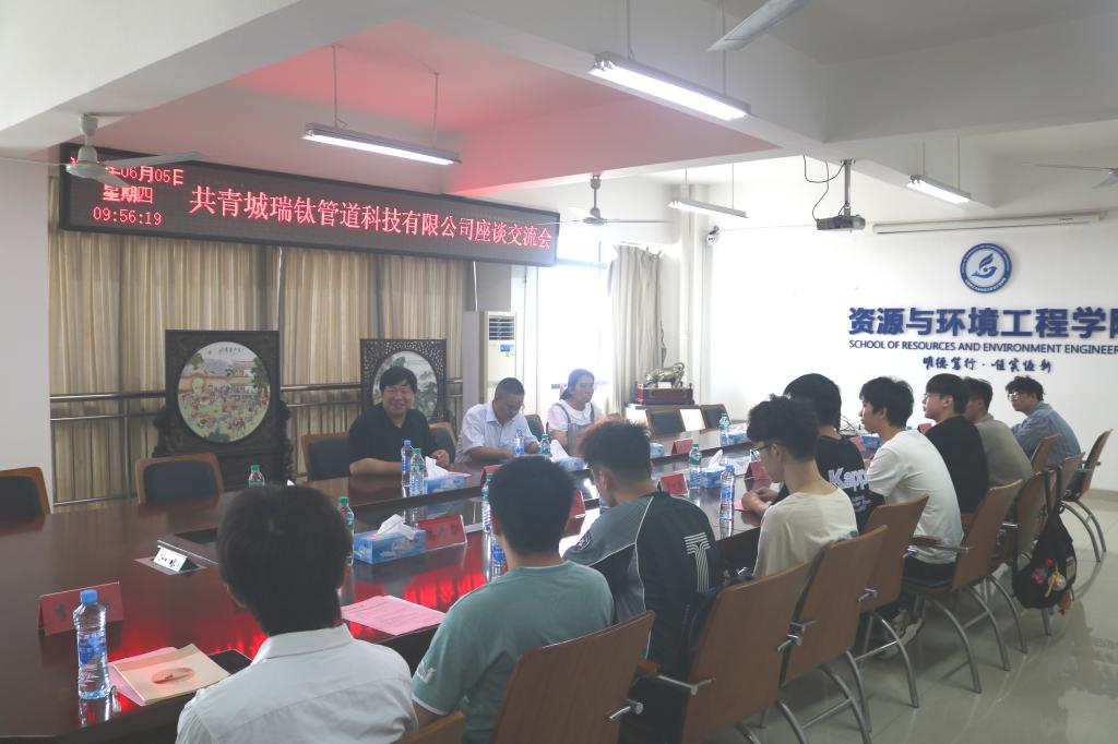 本网讯 6月5日,为促进校企联合、帮促学生就业规划。共青城瑞钛管道科技有限公司副总经理万建、行政经理黄文娟来校并于黄金校区逸夫实验楼第一会议室召开校企座谈交流会,学院学工办主任、团委书记刘浩和2022级采矿工程学生代表参加了座谈。会议由刘浩主持。