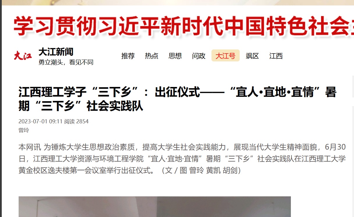 本网讯 为锤炼大学生思想政治素质,提高大学生社会实践能力,展现当代大学生精神面貌,6月30日,华体会网页版登录入口“宜人·宜地·宜情”暑期“三下乡”社会实践队在江西理工大学黄金校区逸夫楼第一会议室举行出征仪式。(文/图 曾玲 黄凯 胡剑)
