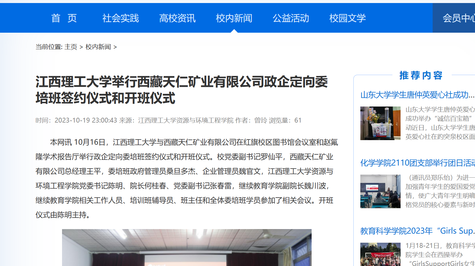 本网讯 10月16日,江西理工大学与西藏天仁矿业有限公司在红旗校区图书馆会议室和赵氟隆学术报告厅举行政企定向委培班签约仪式和开班仪式。校党委副书记罗仙平,西藏天仁矿业有限公司总经理王平,委培班政府管理员桑旦多杰、企业管理员魏官文,华体会网页版登录入口党委书记陈明、院长何桂春、党委副书记张春雷,继续教育学院副院长魏川波,继续教育学院相关工作人员、培训班辅导员、班主任和全体委培班学员参加了相关会议。开班仪式由陈明主持。