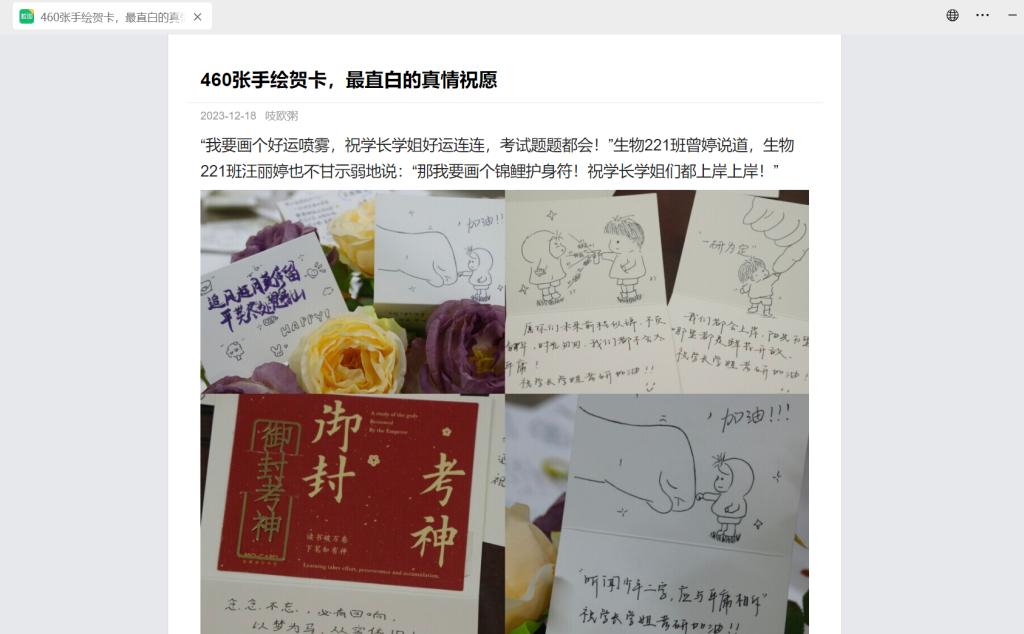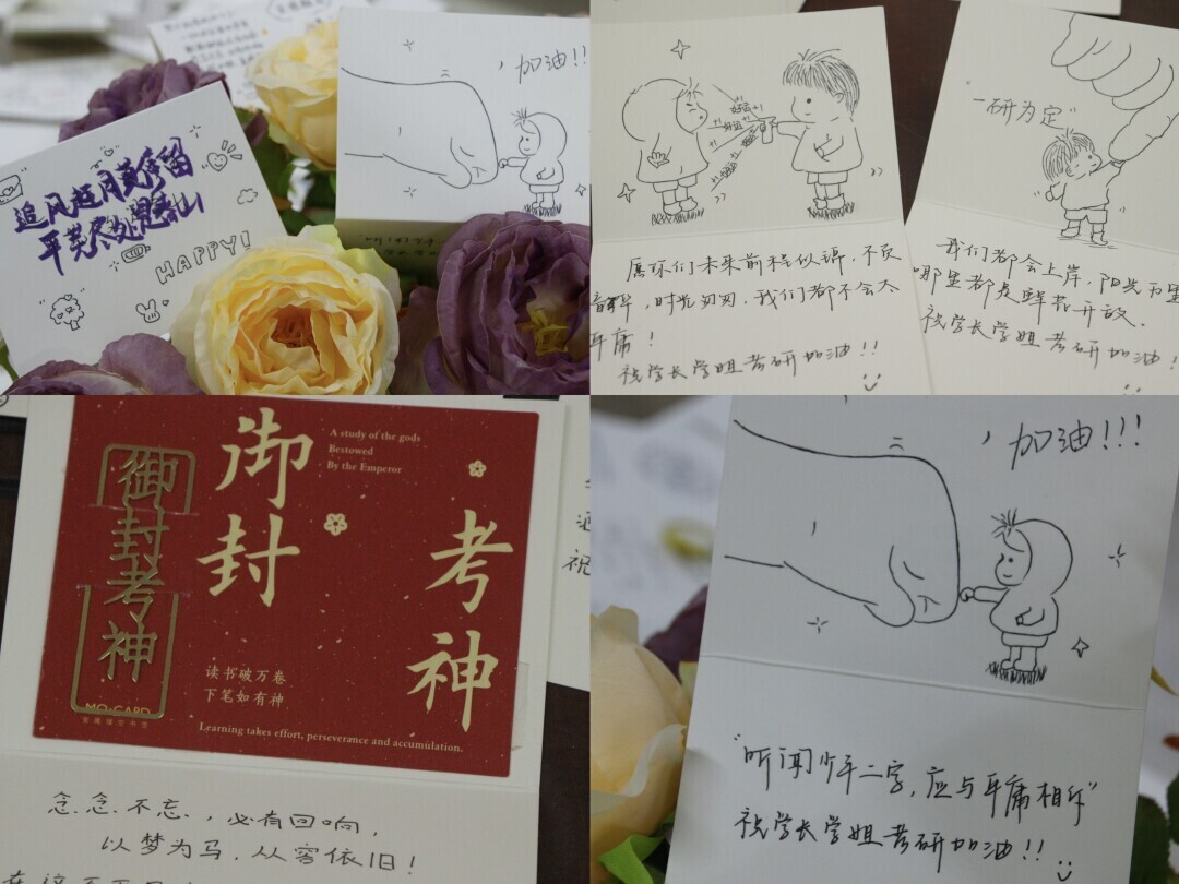 对此次考研送祝福的活动,梁颜祯老师说道:“在考研的最后时刻,积极良好的心态对考研学生们尤为重要,460张手绘贺卡在给考研学生带来温暖的同时,也有助于让考研学生处于一个良好的应考状态,让资环的温暖浸入到每一个考研学子的心田,让这条考研路不再孤单。”
