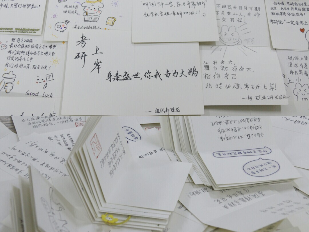 为了提高学生考研热情,减轻考研学生的精神压力,11月27日晚,华体会网页版登录入口于黄金校区逸夫楼A618向各部门分发460张祝福贺卡,用不同的创意手法为考研学生绘制真情祝福。在大家的共同用心创造下,不到一天的功夫每张贺卡就已经绘制了许多创意简笔画和满满的祝福语。这些手绘贺卡里有“一研为定”、“好运喷雾”、“好事发生”、“前程似锦”、“考研上岸”等多种含义,一张小小的贺卡里绘制了可爱生动的简笔画人物,也透露出大家对考研学长学姐最直白的真情祝愿。“在信息快速发展的时代,手写贺卡我已经很久没有收到过了,更何况还是这么可爱暖心又具有真情实感的祝福贺卡,我打开的时候立马被贺卡上的可爱简笔画和美好祝愿给深深吸引到了。”采矿工程202班梁仕湘笑着说道,边说边把贺卡认真的放在了自己备考桌子上,希望给自己最后二十几天的考研生活再鼓鼓劲。