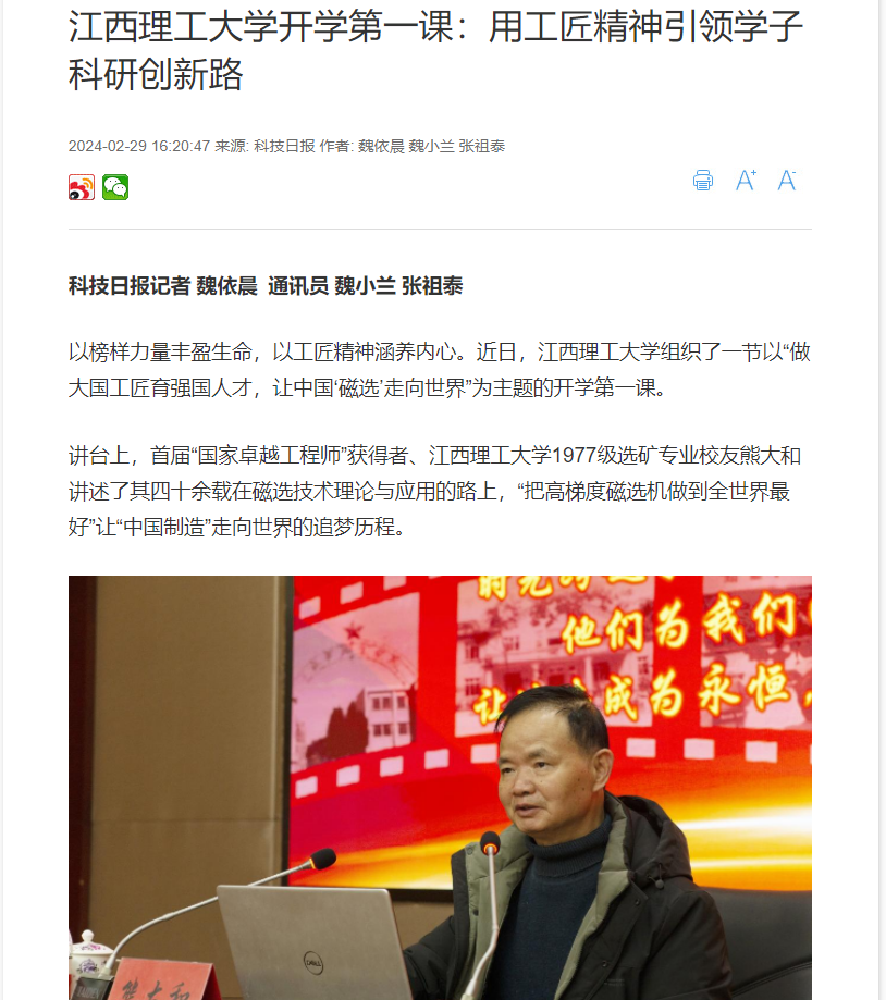 讲台上,首届国家卓越工程师获得者,我国著名的磁电选矿领域专家、江西理工大学1977级选矿专业校友熊大和讲述了其四十余载在磁选技术理论与应用的路上怀揣梦想、攻坚克难、勇攀高峰,将工程科技成果写在祖国大地上,“把高梯度磁选机做到全世界最好”让“中国制造”走向世界的追梦历程。