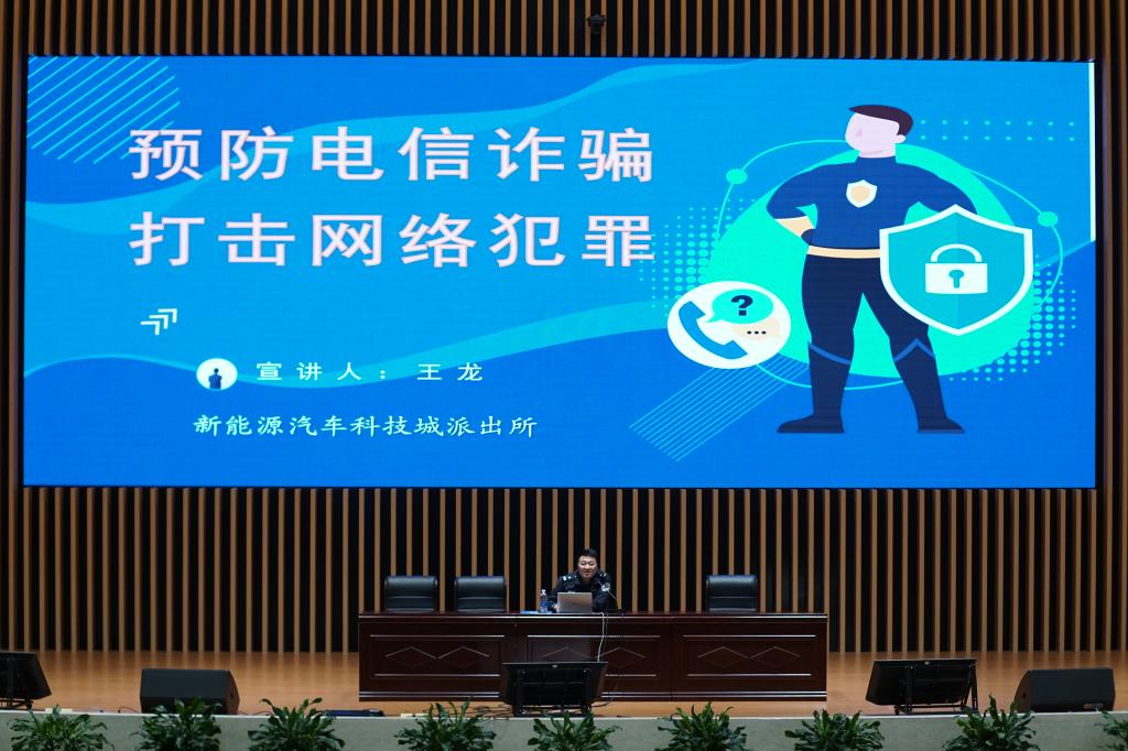 本网讯 11月12日晚,为提高新生的防骗意识,防范电信网络诈骗,我院在三江校区志远会议中心1号厅举办了2024级新生反诈骗专题教育讲座。赣州市南康区新能源汽车科技城派出所王龙警官以“预防电信诈骗,打击网络犯罪”为主题,为2024级新生带来了一场生动而富有教育意义的宣讲。