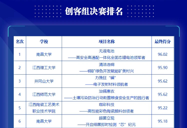 本网讯  9月4日上午,第八届“创客中国”江西省中小企业创新创业大赛颁奖仪式在南昌举行。我院所推荐的《清洁选铜——铜矿绿色开发赋能矿美村兴》项目团队一往无前,经过项目网评、前期初赛、省复赛和省决赛等环节,最终从全省众多参赛项目中脱颖而出,跻身创客组10强第2名获二等奖的好成绩。我校荣获“优秀组织奖”。