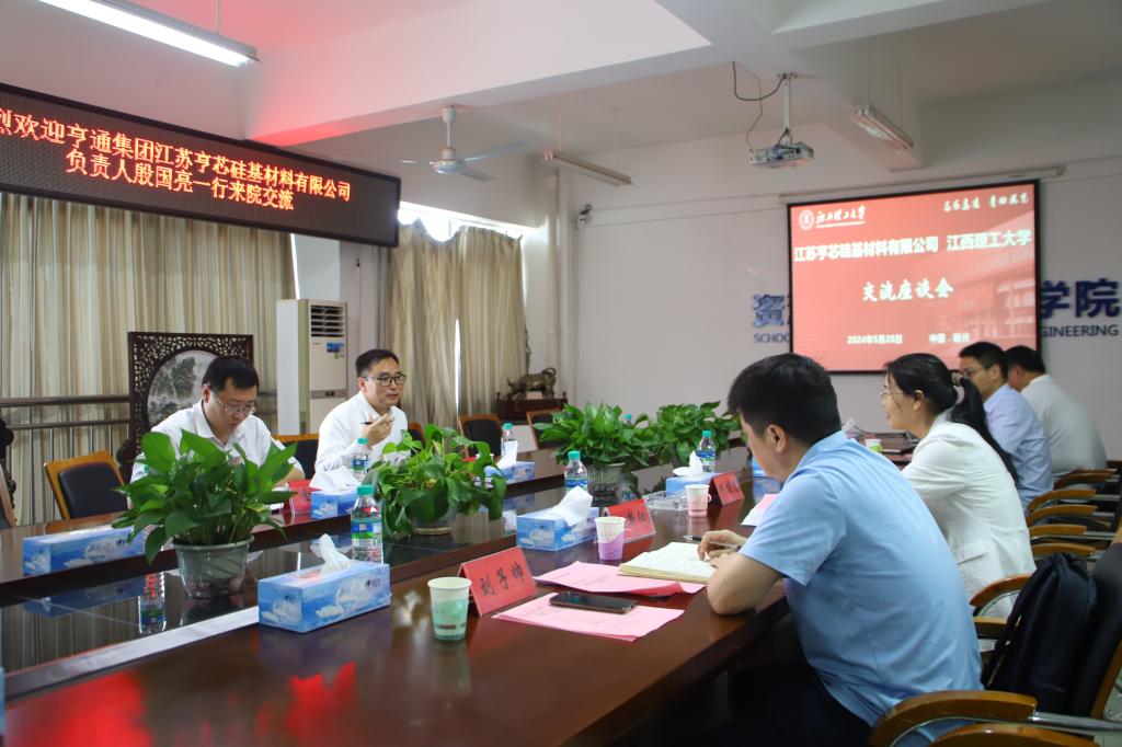 本网讯 5月28日,江苏亨芯石英科技有限公司董事长、江苏亨芯硅基材料有限公司负责人殷国亮,江苏亨芯硅基材料有限公司人力资源部负责人金雷一行来访交流,我院院长何桂春、党委副书记张春雷、副院长余新阳和相关专业老师接待了殷国亮一行,并在黄金校区逸夫楼第一会议室举行座谈交流会。会议由何桂春主持。