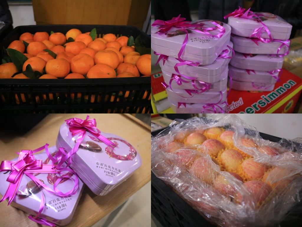 陈飞还贴心的为地质专业的10位女生每人额外准备了一盒巧克力。随着一声“开吃”令下,同学们都蜂拥至各种水果前,挑选着自己喜欢的水果,脸上洋溢着快乐的笑容。陈飞还大把大把往同学们的袋子中塞水果,让同学们多带点回去吃。
