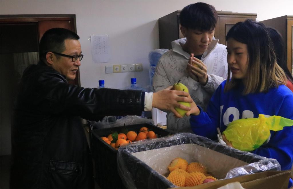 “早就听学长学姐说过‘大飞哥’每年都会给学子送祝福,今年也特别期待,自己买水果都是一小袋一小袋的买,今天实现了水果自由,‘大飞哥’的鼓励让我备受鼓舞,在寒冷的冬天里感受到一股暖流。”地质192班刘文斌笑着说。