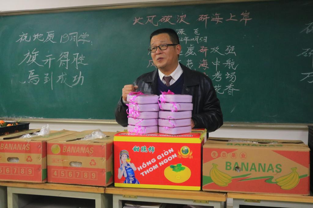陈飞早早来到学校,带领着13名男生从楼下一同将自己精心挑选准备好的12箱苹果、橘子、赣南脐橙、柿子、香蕉等水果搬上来,这些水果都有着各自的寓意:心想事(柿子)成(橙子)、平平安安(苹果)……陈飞在黑板上写下祝福诗词,给同学们送上美好祝愿:“旗开得胜、马到成功,研业顺利、万事如意。”同时他还在黑板上写下自己创作的藏头诗《长风破浪,研海上岸》:“长思远虑研攻强,风华正茂海中航;破竹建瓴上考场,浪恬波静岸花香。”第一个字连起来是“长风破浪”、第五个字连起来是“研海上岸”。