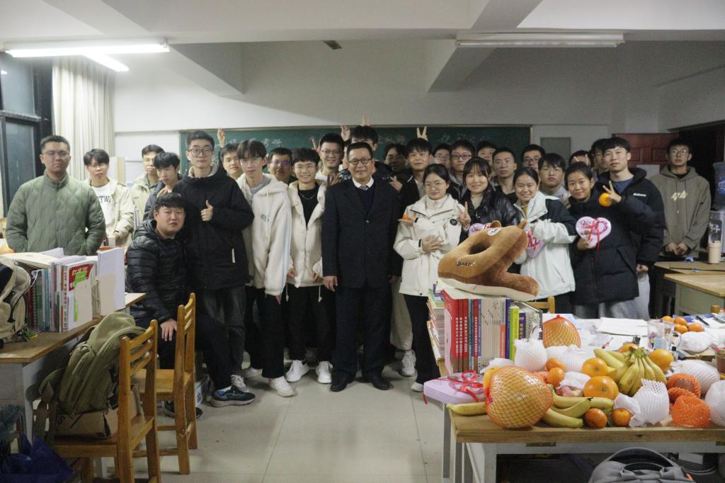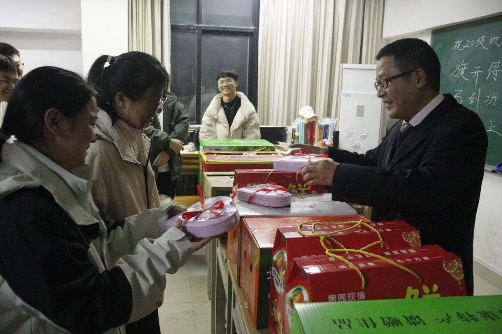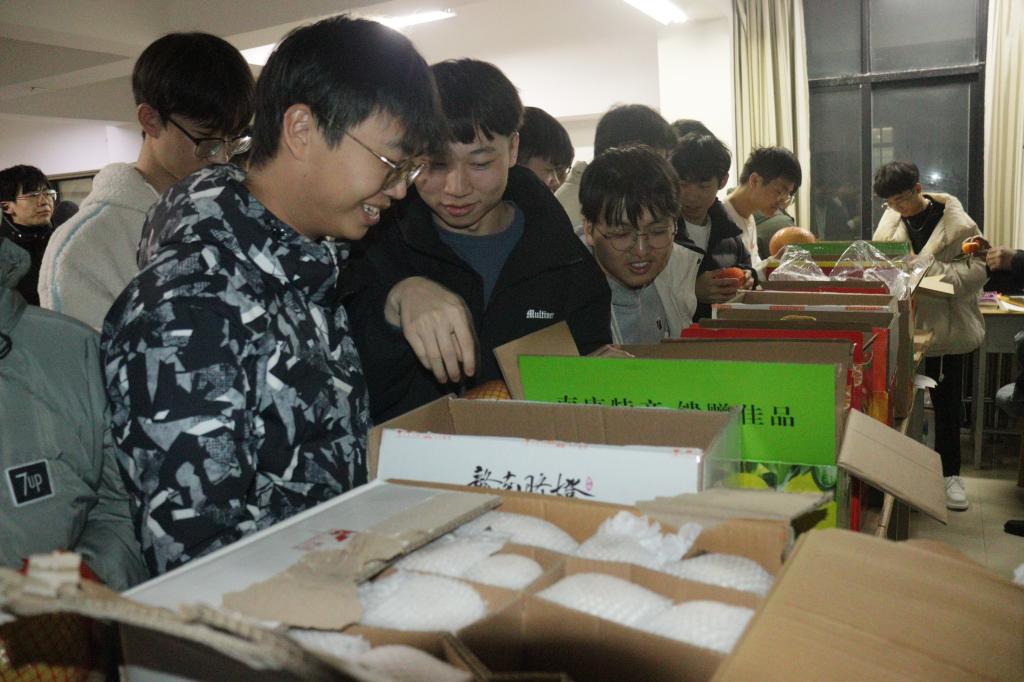 冬天的天空,黑的很快,好似期待晚上即将发生的“大事”。傍晚,逸夫楼下,陈飞带领16位男生一起将一箱一箱的水果搬到自习室。橘子、柿子、橙子、苹果、香蕉、柚子等水果罗列在自习室的桌子上,备考的学子们也一改往常的平静,嗅着水果香味搓手。一位学子问道:“大飞哥,这些水果有没有什么寓意啊?”陈飞每说一句祝福,便指向对应的水果:“考研大吉(橘)、心想事(柿)成(橙)、平平(苹果)安安、频交(蕉)好运、成事有(柚)你”。顿时,掌声不断,欢呼不绝,喜悦之情爬上了每一位学子的眉梢。