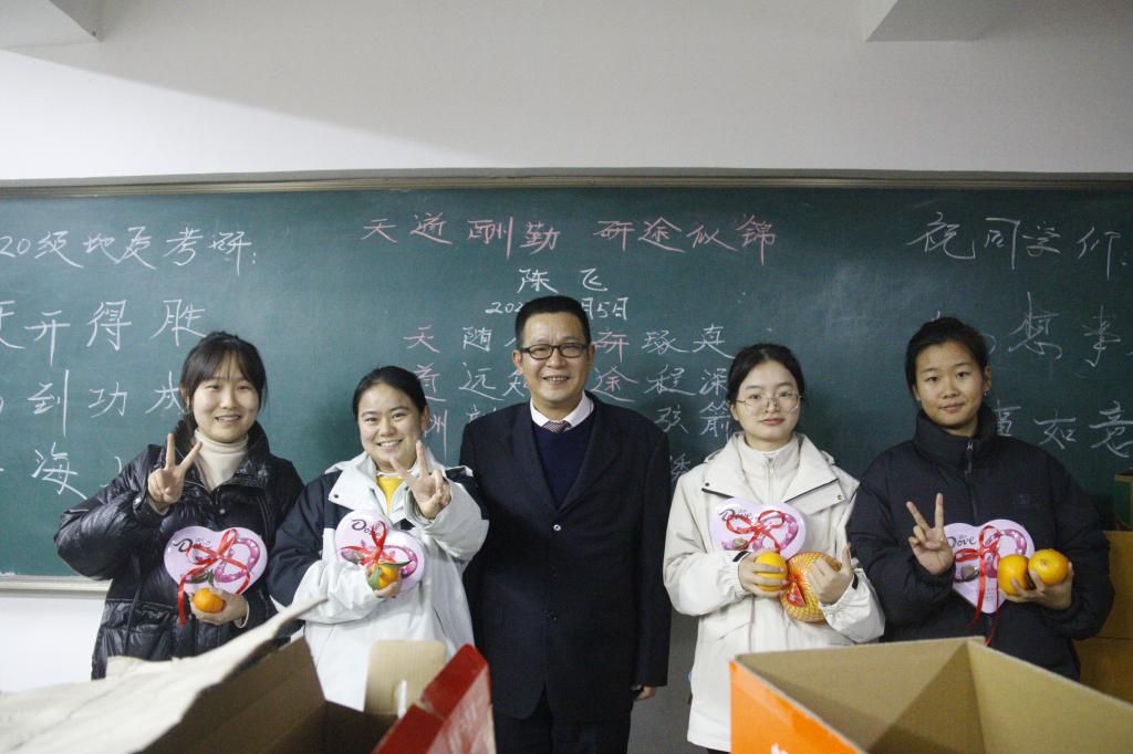 本网讯 为激励即将考研的地质专业的学子,12月4日,我院副院长陈飞在黄金校区逸夫楼A726考研自习室为地质专业学生送上水果祝福,为学子们加油打气,祝学子们研海上岸。