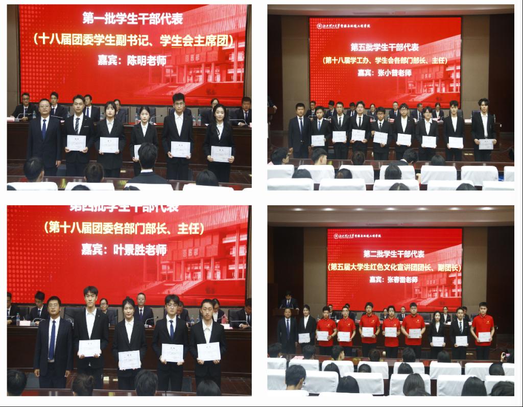 会上,各领导、老师为第十八届学工办、团委、学生会、研究生会学生骨干及第十三届党建联合会、第五届大学生红色文化宣讲团主要学生干部代表颁发了聘书;第十届学生干部第十届学工办、团委、学生会研究生会及第十届党建联合会届大学生红色文化宣讲团主要学生干部佩戴工作证。