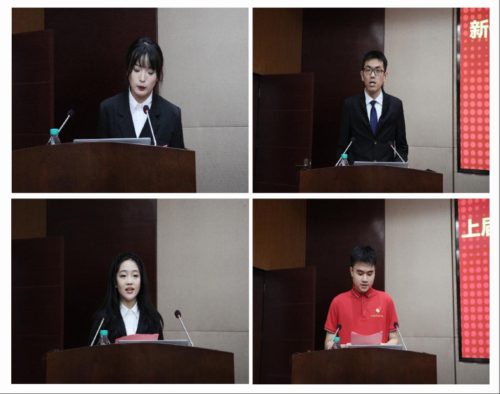 新一届学生干部代表、第十届研究生会执行主席马金鹏、学生会执行主席高峰,届大学生红色文化宣讲团团长吴嘉慧依次上台发言,感谢了上一届学长学姐们在工作中的辛苦付出和学院的栽培,代表新一届团队表达在今后工作中肯吃苦、踏实办事、敢为人先的工作态度。