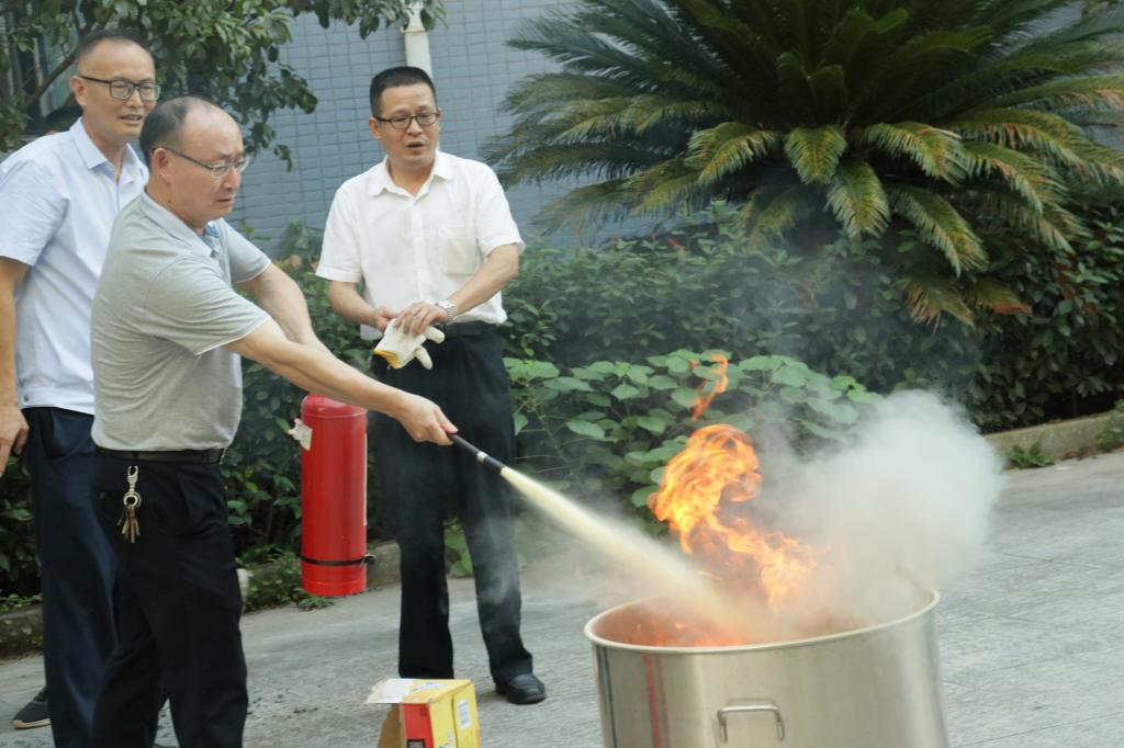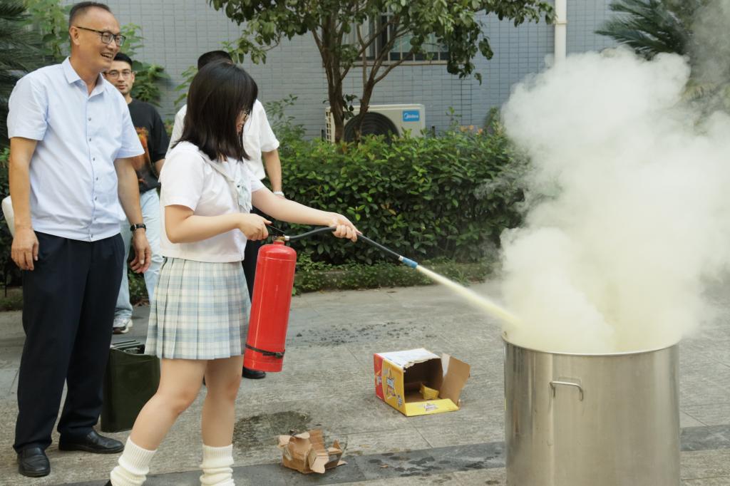 学院实验中心主任刘智林一边操作灭火器灭火,一边讲解步骤和要诀。在工作人员的看护下,学院教师和学生轮流使用灭火器进行灭火演练。